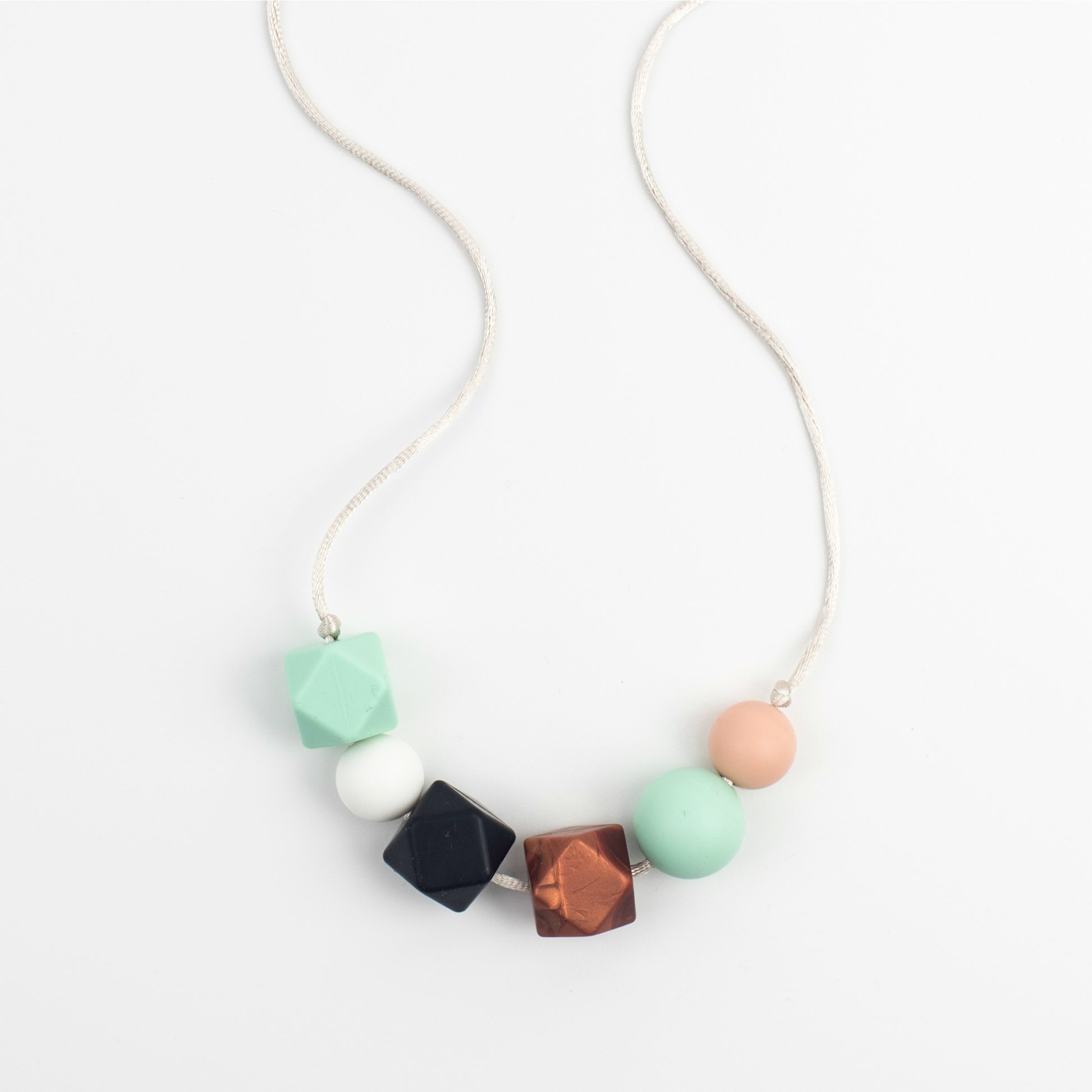 Martha is pretty asymmetrical design in mint, copper, black and neutral tones, featuring round and geometric beads. Baby will love to play with and chew the beads, soothing aching gums.