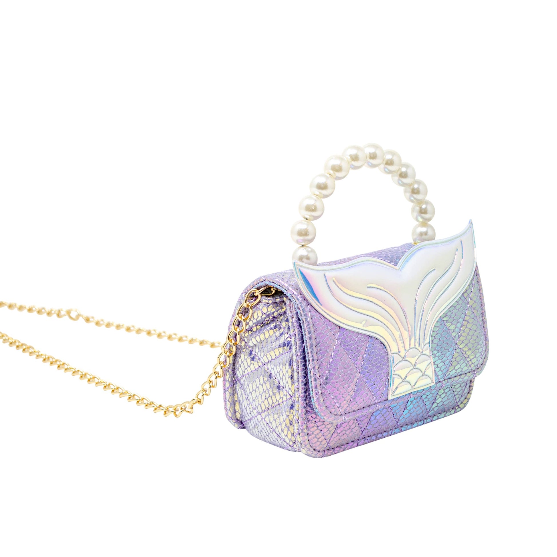 Our Enchanted Mermaid Handbag, designed for the little dreamer in your life. This captivating girls' handbag dazzles with a shiny glitter quilted finish, making every outing a sparkling occasion. The elegant pearl handle adds a touch of sophistication, while the versatile chain allows it to be worn comfortably over the shoulder or crossbody, adapting to any adventure. A magnetic flap closure keeps treasures secure, and the large mermaid fin charm on the flap ensures this bag stands out in a sea of style. Perfect for parties, playdates, or any magical moment, this handbag is sure to make a splash!