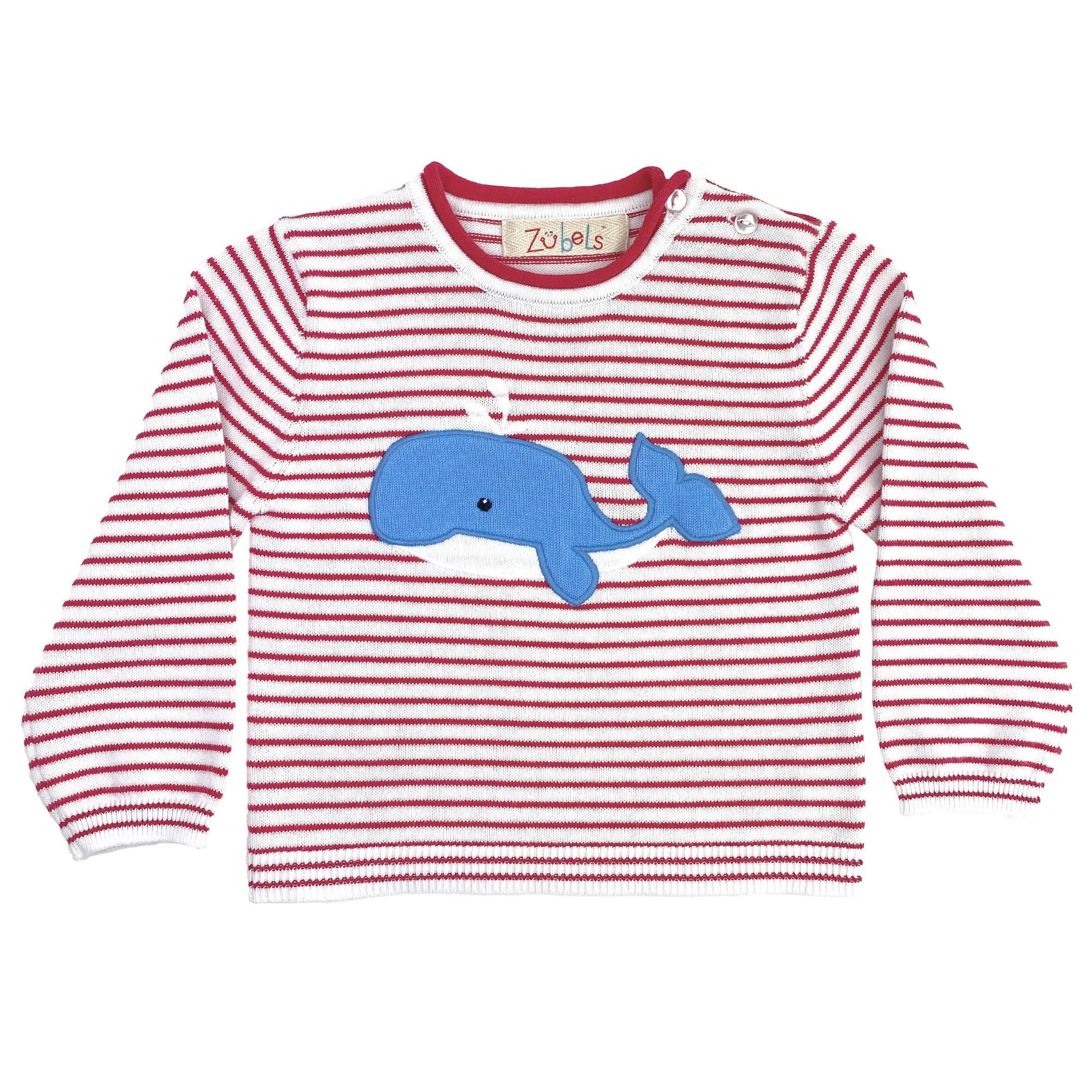 This fine gauge whale knit sweater is made using all natural 100% cotton yarns and eco-friendly dyes making a soft and elegant sweater that any child is sure to love. Our lightweight knit sweater comes in a fun nautical red and white stripe pattern features an embroidered whale on the front and is machine washable for easy care!